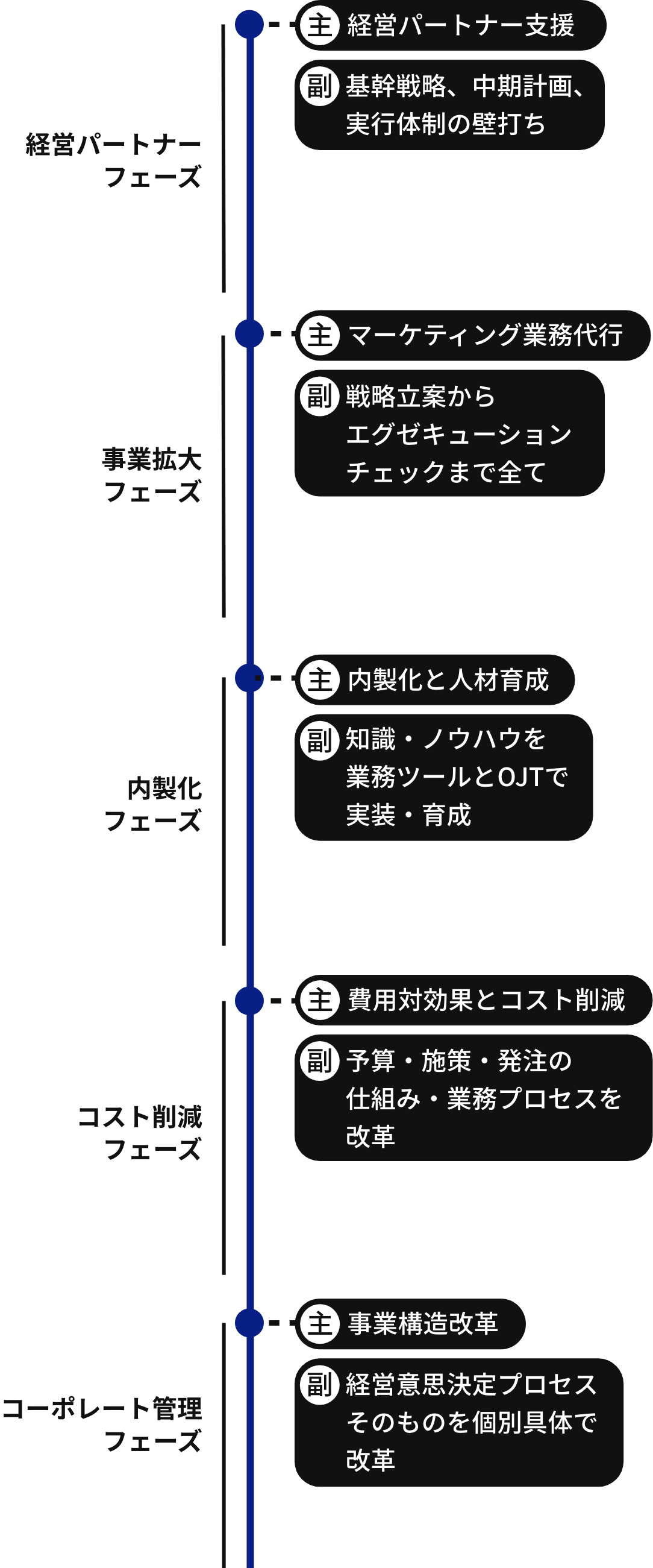 マーケティングCFOとして、クライアントの事業フェーズに沿ってソリューションを提供しています。 全てのフェーズにおいて定量的な成果と人材の育成をお約束します。